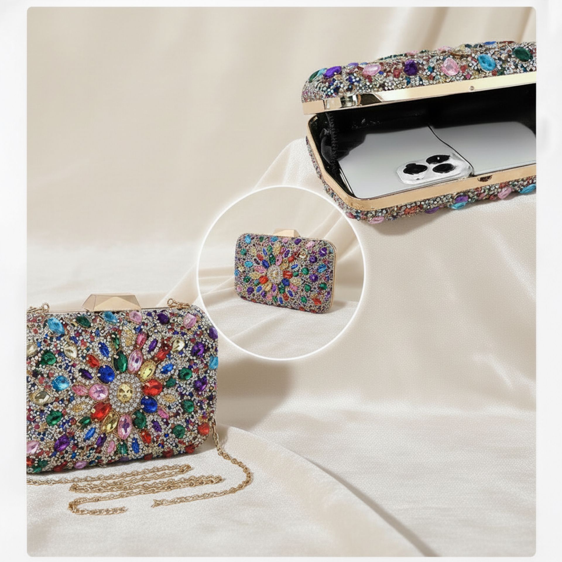 Elevate your style with our stunning Gemstone clutch, ideal for evenings and special occasions.